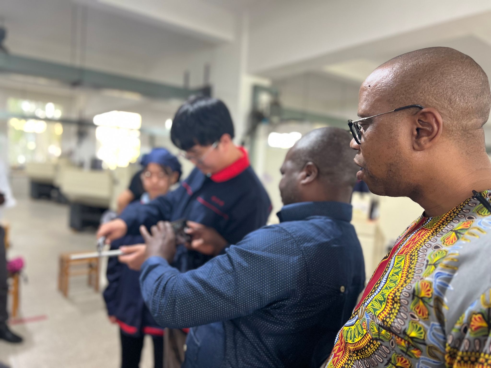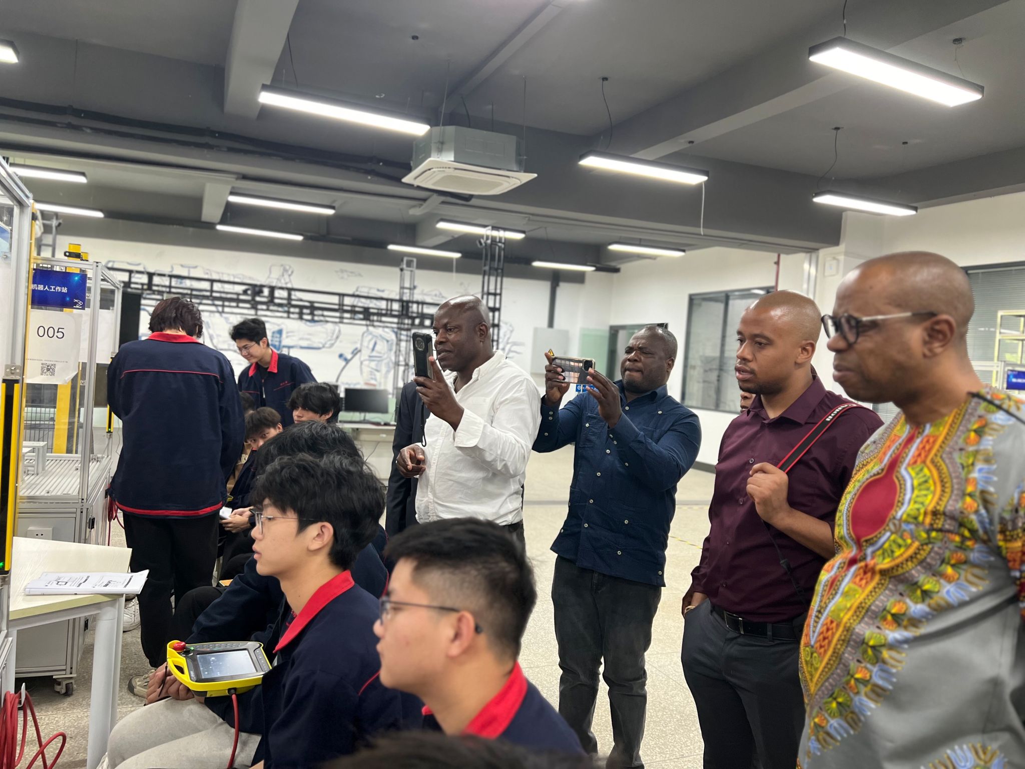 5月13日,文达大学来访湖北工业大学期间,绿色科技孔子学院外方院长Prof. Eric Maluta、校长办公室战略监管评估主任Dr. Mutshinyalo Ratombo、理工农学院院长Natasha Potgieter以及物理系主任Fhulufhelo Nemangwel等一行7人参观了现代工程训练与创新中心,并对中心内的各项设施和现场教学给予了高度评价。创新创业学院副院长马小红、《现代工程训练》课程教研室主任袁慧铮参与接待和讲解。