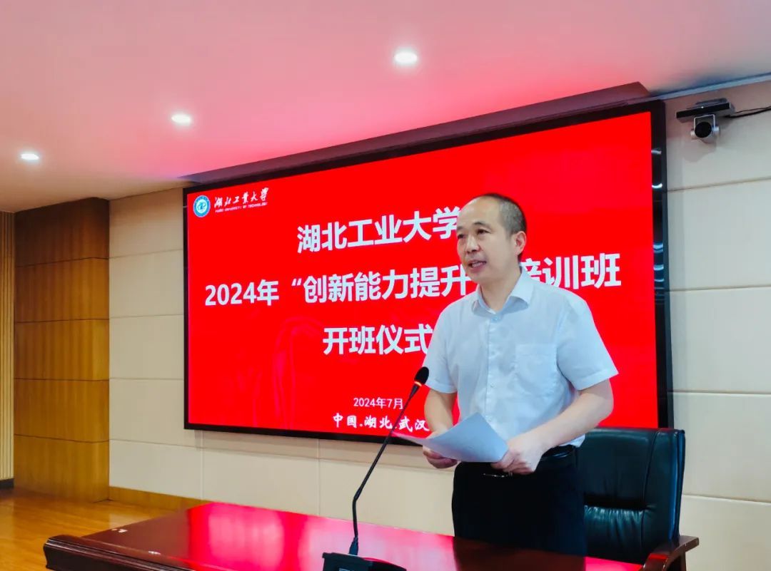 创新创业学院副院长柯长仁在开班仪式上讲话。柯长仁再次对全体参训学员表示欢迎,对组织本次培训的创新思维与方法教研室表示肯定,对三位教授前来授课表示感谢。柯长仁指出,湖北工业大学一直秉承产科教融合的理念,营造创新氛围、推广创新方法、培养创新人才,充分发挥创新方法在增强企业创新动力和激发企业科技人才创新活力方面的积极作用,精准助力企业科技创新、服务科技工作者成长成才。柯长仁在最后表示,创新创业学院将尽最大努力将此次培训组织好,确保培训有内容、有细节、有温暖,期望学员们能够专心致志,最终用培训获得的理论知识运用到工作实际,开拓创新,服务行业,服务湖北,提高我省企业创新工作水平。