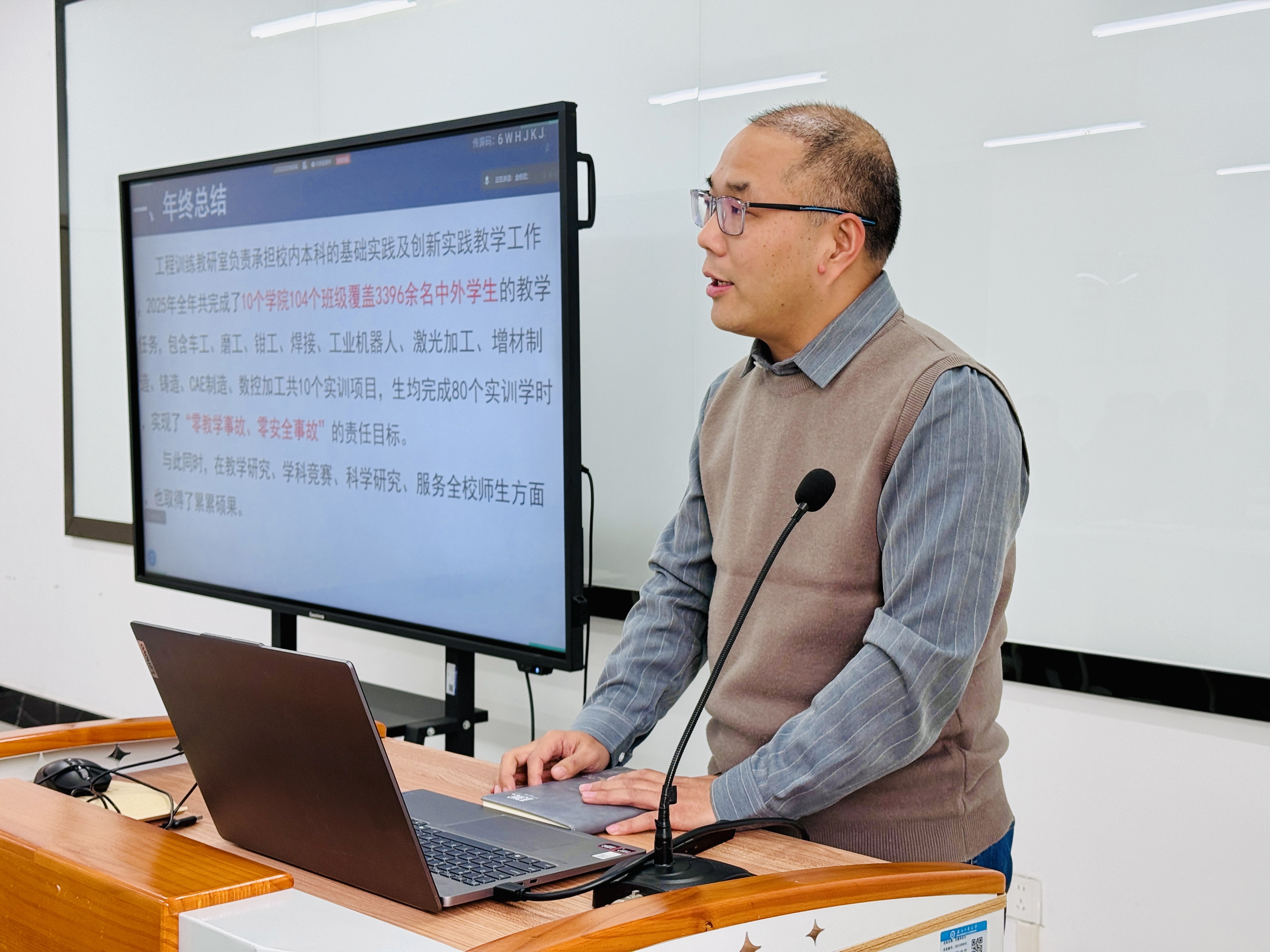 工程训练教研室主任袁慧铮指出,在全体工训教职工的共同努力下,圆满完成了2025年工程训练教学任务,并且实现了“零教学事故、零安全事故”的责任目标。他向大家展示了教研室在教学研究、学科竞赛、科学研究、服务全校师生方面的成果,“教学+教研+竞赛+科研”复合发展架构为我校工程训练的发展构建了坚实的立足点。他希望全体工训教职工兢兢业业,再接再厉,持续做好课程优化,为下学期即将到来的文科专业进工训做好准备。