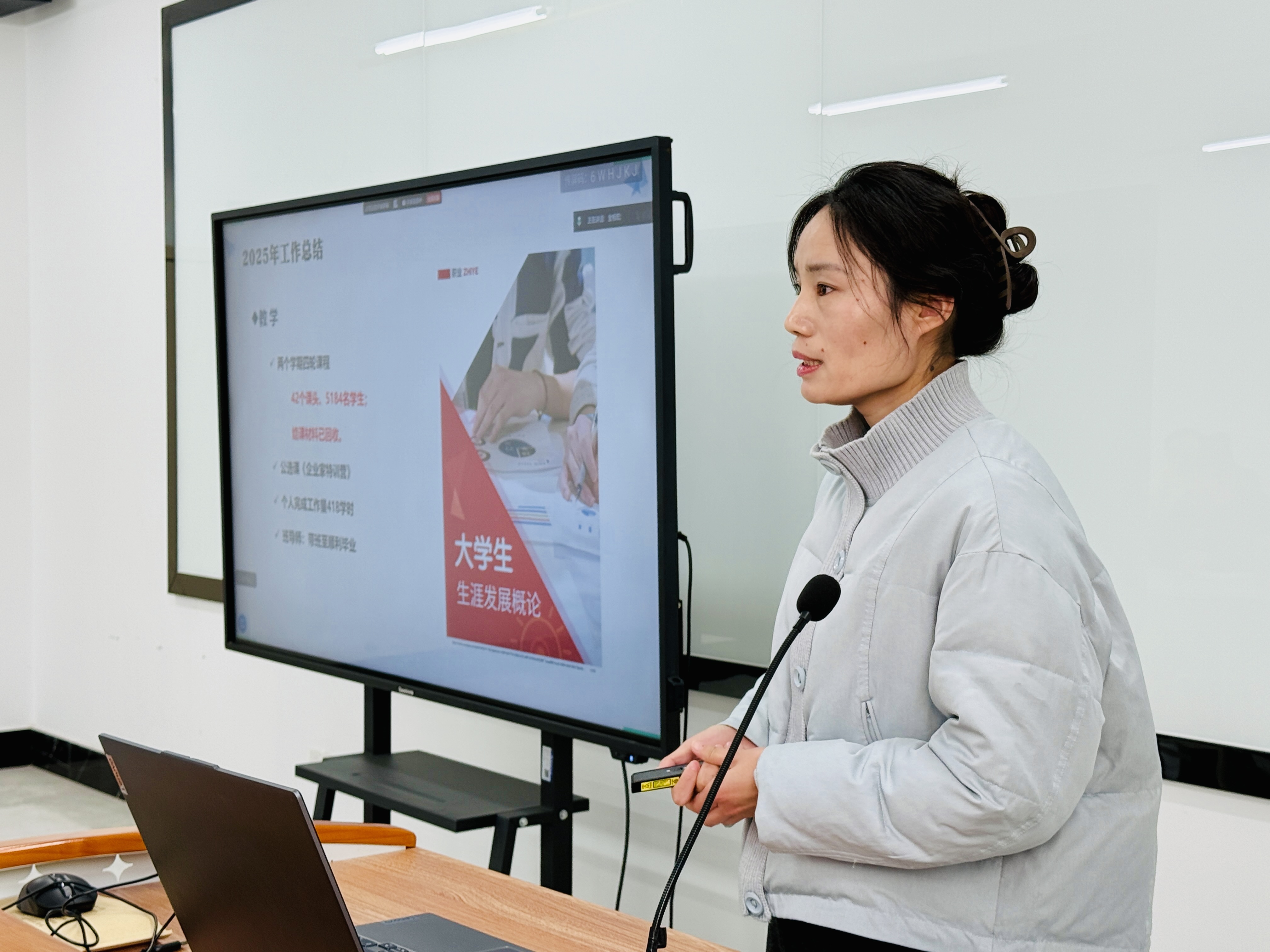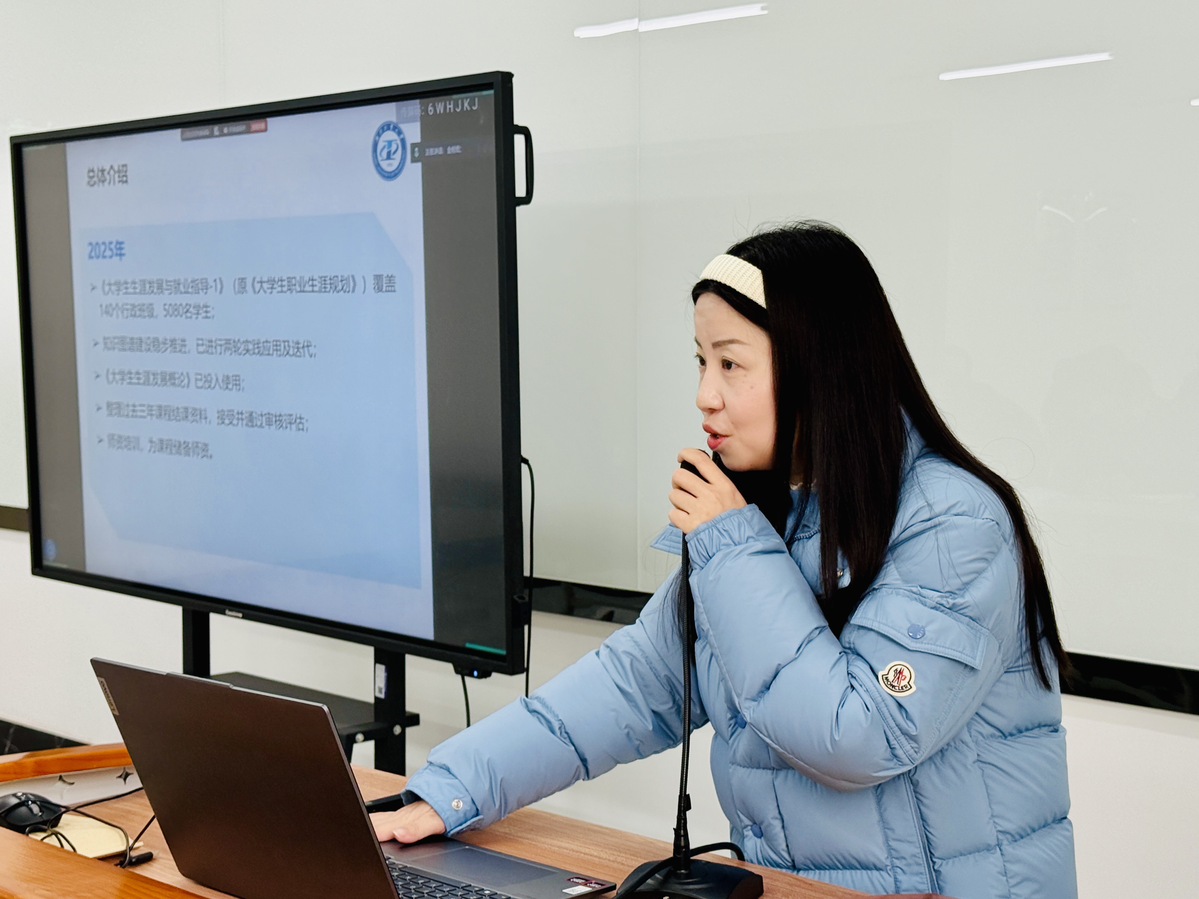 原大学生就业指导教研室主任张珍从教学、教研、科研及公共服务四个方面系统汇报了2025年工作。她重点介绍了教学任务完成情况,以及数字化教材出版、微专业建设、知识图谱平台应用、教学成果省级申报、课程材料迭代、省级教研项目申报、人工智能赋能高等教育案例申报、审核评估特色案例撰写等教研成果,同时汇报了科研课题申报与结题进展,并列举了在师资培训、讲座分享、学生指导等方面开展的多样公共服务。最后,她对教研室的教学教研深耕与未来转型发展表达了展望,表示会一如既往地关注并支持教研室的发展和建设。