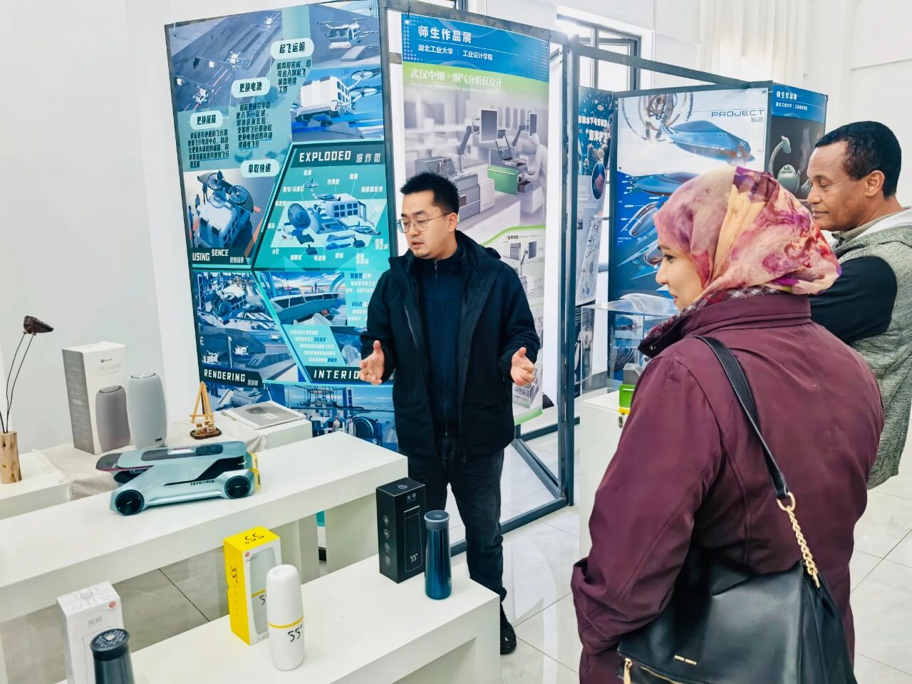 在未来产业梦工场,工业设计中心负责教师周红宇详细阐述了“未来产业梦工场”的建设理念、重点发展领域、管理运行机制以及部分展览作品。代表团成员在展台前驻足观看学生工业设计作品,对学生课程作业与毕业设计所呈现的创意与才华表示赞赏,并对梦工场所践行的“产教融合、科教融汇、校地共建、双向赋能”建设模式给予高度评价。