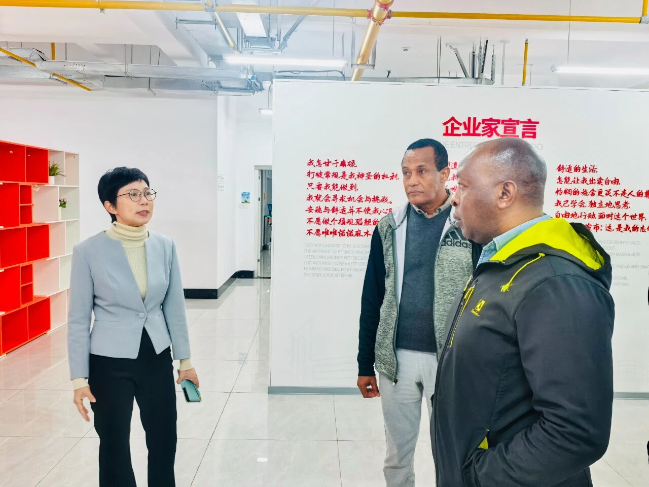 随后,代表团参观了学校科技企业孵化器。翟良芳着重介绍了学校创业支撑体系的具体内容,并带领代表团深入创业空间和初创空间,实地感受企业的办公环境与学校的创新创业文化氛围。在艺术品集市,代表团对艺术设计类作品啧啧赞叹,并对集市的运营模式及作品可市场化交易的机制表示高度认可。
