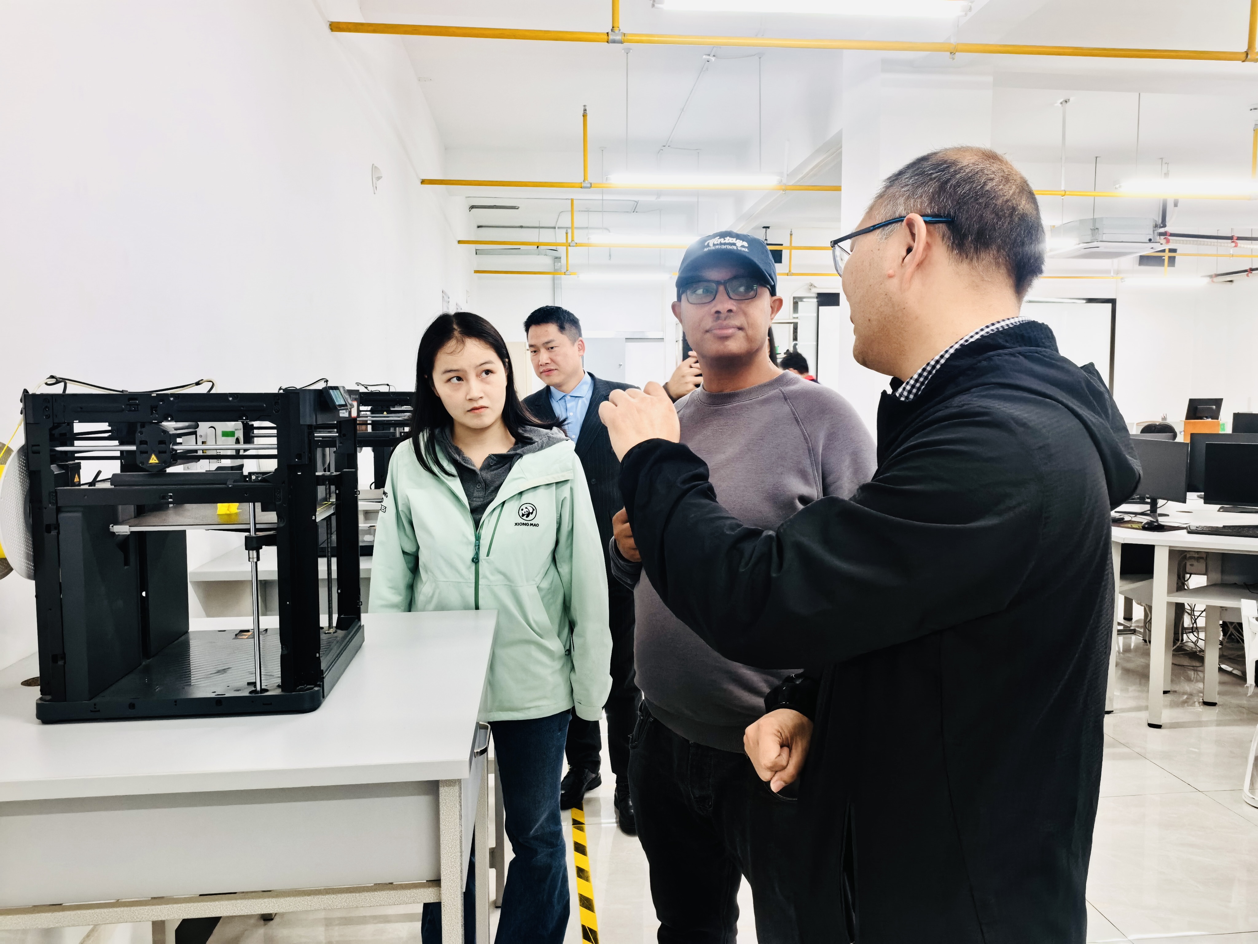 袁慧铮向来访人员介绍了学院的工程训练体系构成与特色,并带领大家重点参观了部分实训室。伊特巴雷克一行观摩了《工程训练》课程教学实况,听取了数控加工、激光加工等实践单元的介绍,详细了解了设备运行、课程组织及安全管理情况。在3D打印、工业机器人等实训室,来访人员对这些前沿技术领域的工程教学与研究情况进行了深入了解,对同学们在工程训练课上完成的作品表示赞赏。