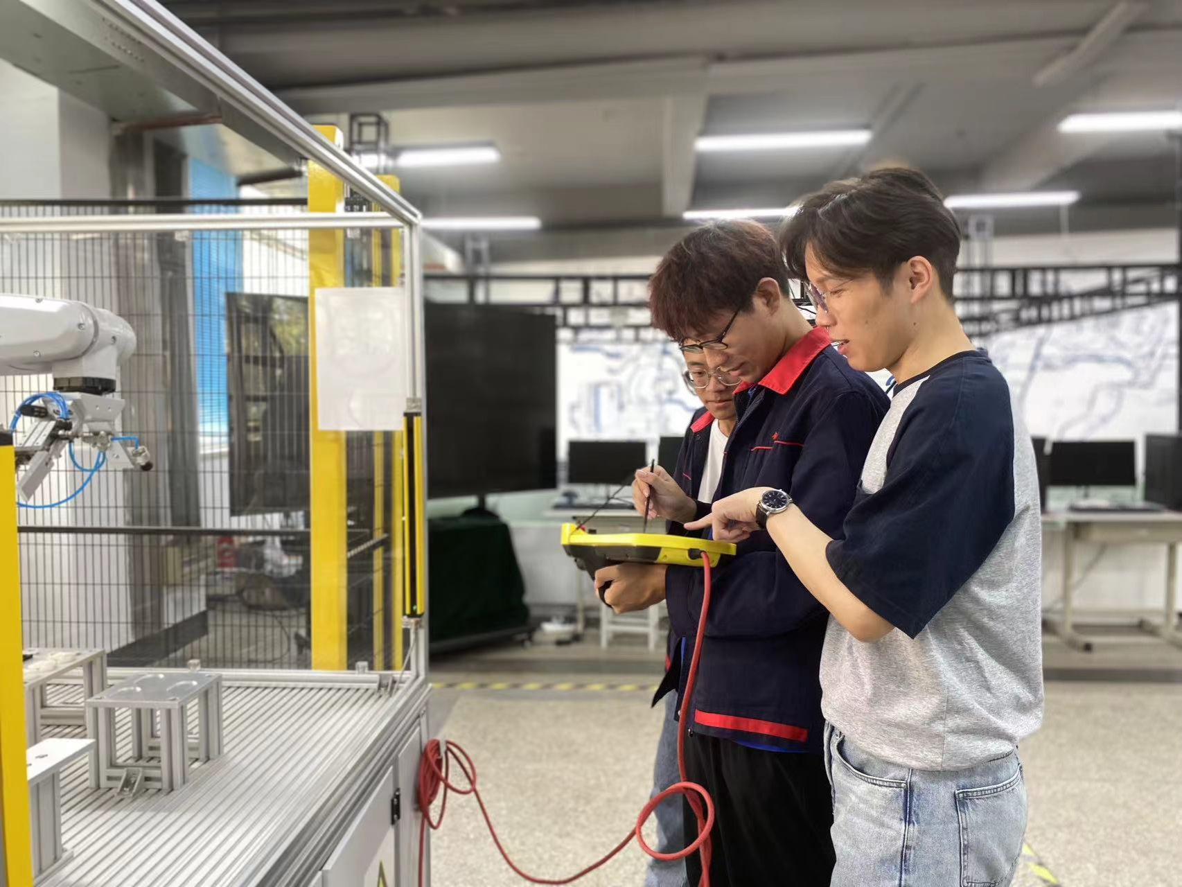 (2)机器人实训,学时0.5天。主要内容:机器人搬运实训模块操作;模拟涂胶实训模块拆装及操作;简易拆装机器人的拆卸、装配与调试。